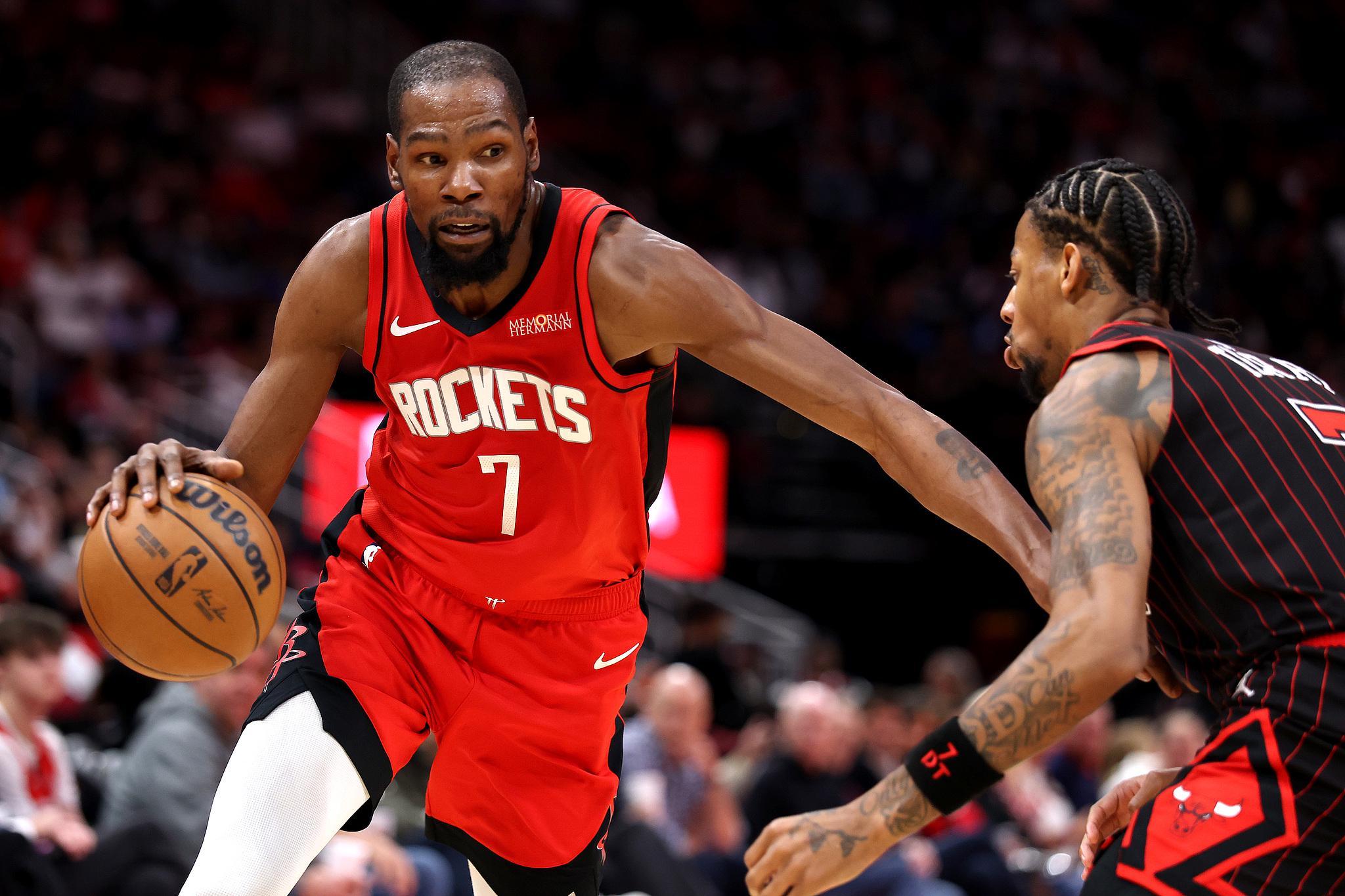 近半个月火箭队困境之中,杜兰特一直扮演着定海神针角色,过去6场比赛他场均砍下29.7分7.5板4.2助,投篮命中率51.5%。