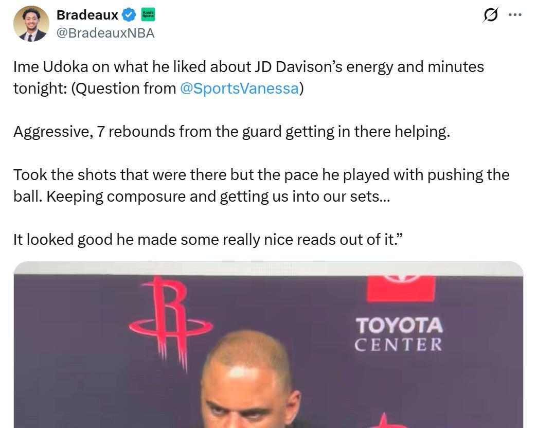 结果JD戴维森给机会真中用,加上谢泼德状态不佳,乌度卡索性直接让戴维森将谢泼德原本末节的轮转时间也一同吃掉,甚至出现在决胜阶段。