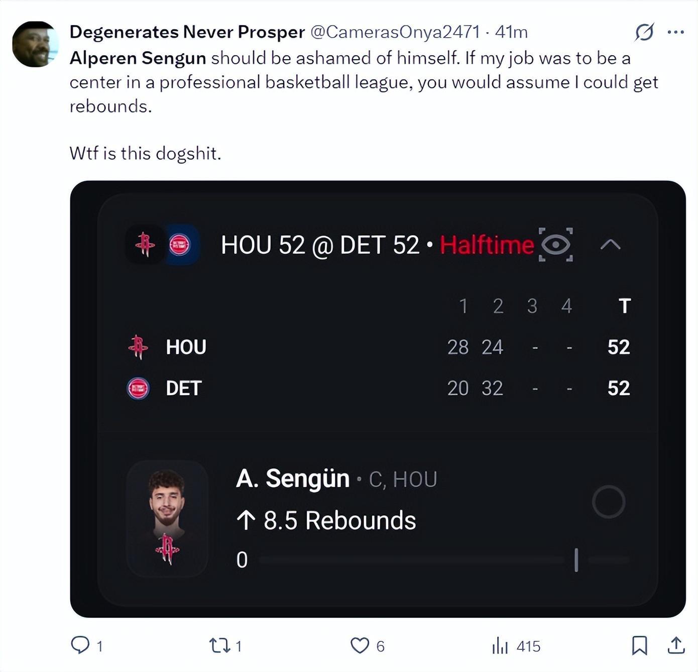 北京时间1月24日,火箭以111-104复仇活塞。这场比赛火箭队的先发中锋阿尔佩伦-申京延续了他对阵费城的低迷状态,此役他的拉胯更盛,火箭球迷们对他已经忍无可忍在社媒上各种炮轰,全都是因为申京作为一名6尺11(2.11米)的中锋只有1个篮板。